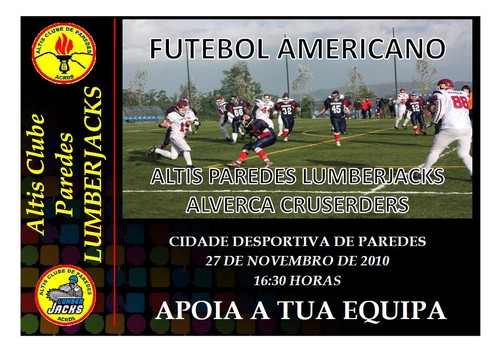 O Altis Clube de Paredes tem a honra de vos informar que os nossos LUMBERJACKS, ( VICE CAMPEÕES NACIONAIS 2009«»2010 ) vão dar início á pré época de Futebol Americano com a recepção da equipa de Futebol Americana de Alverca, os Cruserders. Em Anexo se junta o Cartaz do jogo marcado para o próximo dia 27 de Novembro na Cidade Desportiva de Paredes no Sintético nº 1.